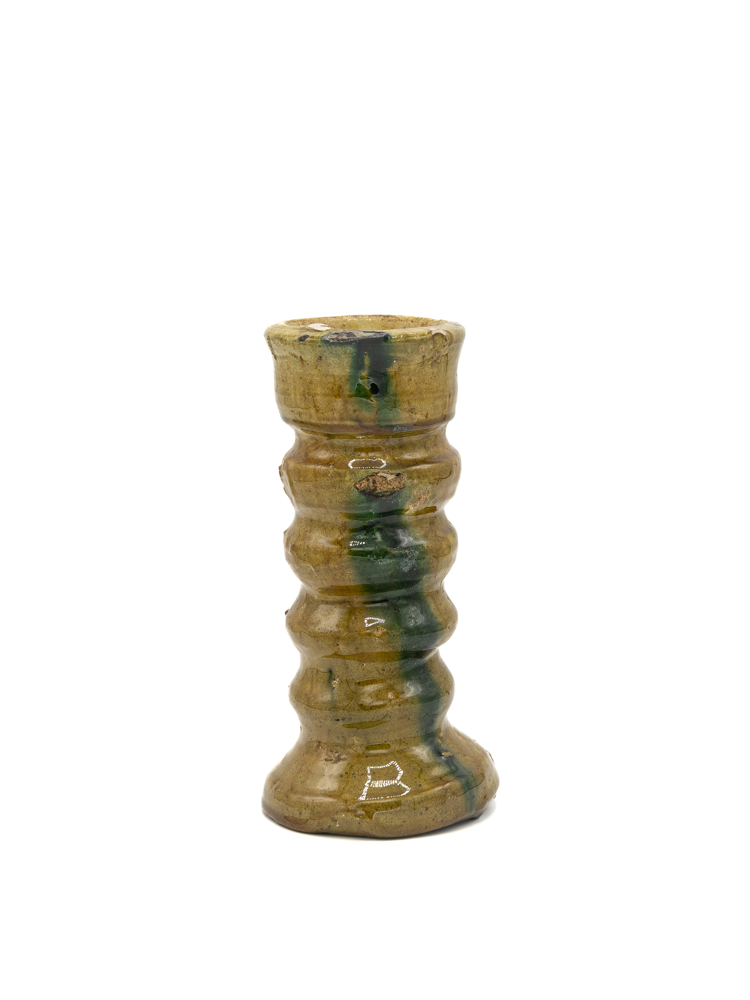 This handcrafted ceramic candlestick is characterized by its distinctive, heavily textured design featuring a series of rhythmic, organic ridges that form a ribbed columnar silhouette. This striking vessel serves as both a functional candle holder and a sculptural accent, perfect for adding a touch of earthy, historical charm to a mantel or dining table.